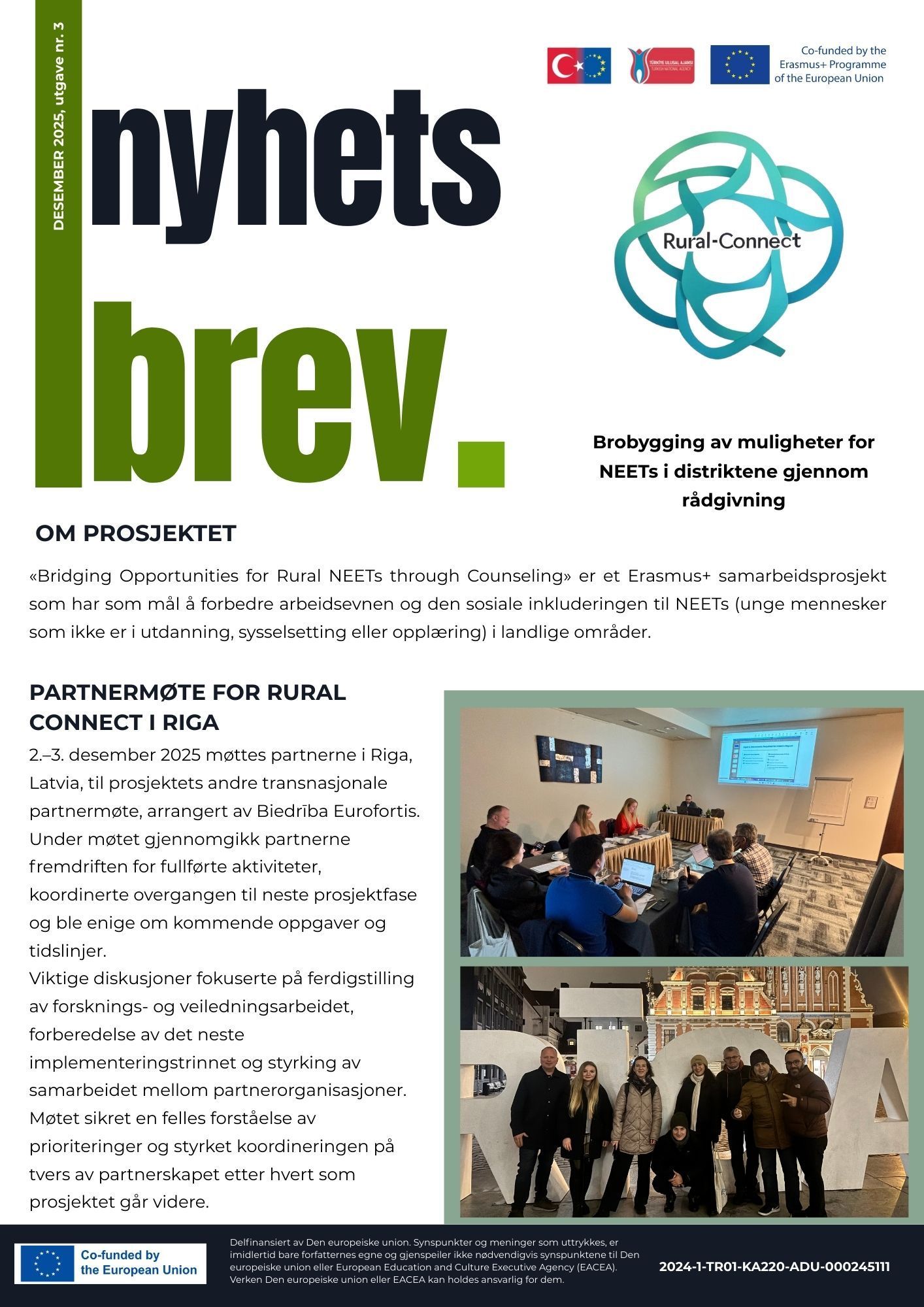 Vi er glade for å dele vårt tredje nyhetsbrev for Rural Connect-prosjektet ! Her finner du en oppsummering av partnernes møte i Riga, fremdriftsrapport for forsknings- og veiledningsarbeidet, og neste steg i utviklingen av den digitale plattformen – alt med mål om å styrke NEET-ungdom i distriktene. Les hele nyhetsbrevet her og få innsikt i hva vi har oppnådd så langt, og hva som kommer i de neste månedene. Newsletter #3 – Rural Connect Project We are happy to share the third edition of the Rural Connect newsletter! This update includes a summary of the partner meeting in Riga, progress on the research and guidance tools, and the next steps toward developing our digital counseling platform — all designed to support rural NEET youth. Read the full newsletter to learn more about our achievements and upcoming activities.